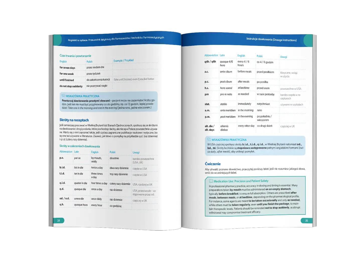Czytelnicy otrzymują gotowe, sprawdzone dialogi i zwroty umożliwiające szybkie przeprowadzenie wywiadu, realizację e-recepty, wystawienie recepty farmaceutycznej oraz przekazanie instrukcji dawkowania. Każdy rozdział kończy się słowniczkiem, komentarzem kulturowym oraz ćwiczeniem utrwalającym materiał.