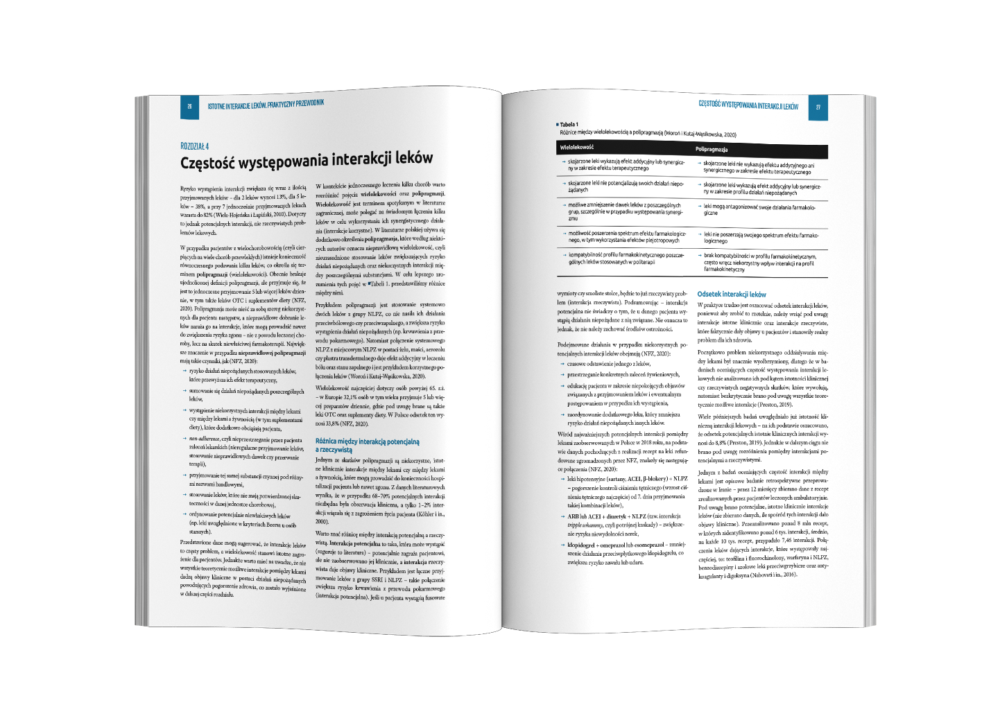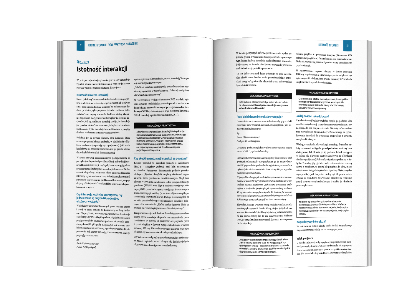 Podręcznik Istotne interakcje leków – praktyczny przewodnik to drugie wydanie cieszącego się ogromną popularnością farmaceutów i techników farmaceutycznych podręcznika w formie przewodnika, który podsumowuje kluczowe wnioski z badań dotyczących interakcji pomiędzy lekami dostępnymi w aptekach w Polsce, w tym także interakcji z żywnością i alkoholem oraz przedstawia praktyczne rekomendacje postępowania. W książce opisano 531 interakcji istotnych w codziennej pracy farmaceutów m.in. interakcję paracetamolu, NLPZ, opioidów, IPP i leków zobojętniających. Książka została przygotowana przez zespół 24 farmaceutów z myślą o pracy z pacjentem, dlatego koncentruje się na interakcjach o znaczeniu klinicznym, pomijając jedynie teoretyczne rozważania. Podręcznik jest odpowiedzią na potrzebę odpowiedzialnego doradztwa w aptece, zgodnego z aktualną wiedzą naukową.