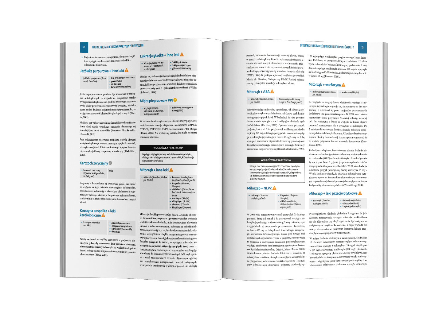 Struktura rozdziałów jest przejrzysta, dzięki czemu odnalezienie istotnych informacji na dany temat jest łatwe i intuicyjne, co pozwala na sprawdzenie interesujących nas informacji nawet przy pacjencie. Dla każdej interakcji omówiono następujące zagadnienia:
