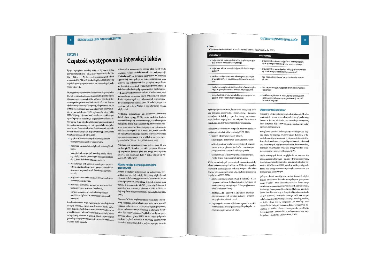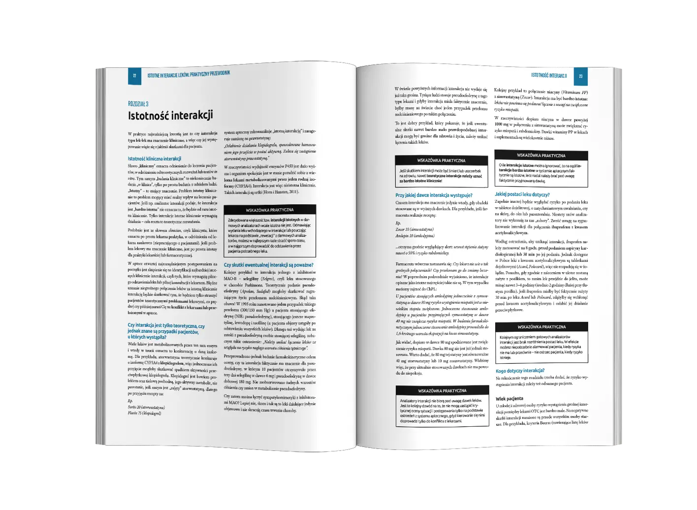 Podręcznik Istotne interakcje leków – praktyczny przewodnik to drugie wydanie cieszącego się ogromną popularnością farmaceutów i techników farmaceutycznych podręcznika w formie przewodnika, który podsumowuje kluczowe wnioski z badań dotyczących interakcji pomiędzy lekami dostępnymi w aptekach w Polsce, w tym także interakcji z żywnością i alkoholem oraz przedstawia praktyczne rekomendacje postępowania. W książce opisano 531 interakcji istotnych w codziennej pracy farmaceutów m.in. interakcję paracetamolu, NLPZ, opioidów, IPP i leków zobojętniających. Książka została przygotowana przez zespół 24 farmaceutów z myślą o pracy z pacjentem, dlatego koncentruje się na interakcjach o znaczeniu klinicznym, pomijając jedynie teoretyczne rozważania. Podręcznik jest odpowiedzią na potrzebę odpowiedzialnego doradztwa w aptece, zgodnego z aktualną wiedzą naukową.
