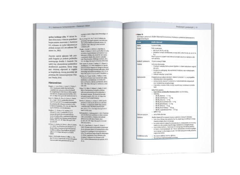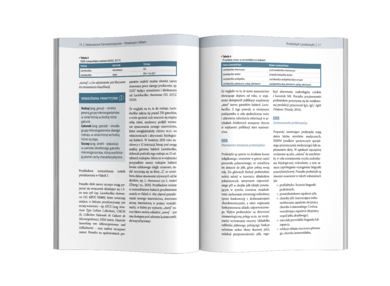 W podręczniku znajdują się liczne tabele, porównujące pod kątem składu, kategorii dostępności, stosowania w określonej grupie wiekowej i warunków przechowywania, dostępne na rynku preparaty zawierające skuteczne w danym wskazaniu szczepy probiotyczne.
