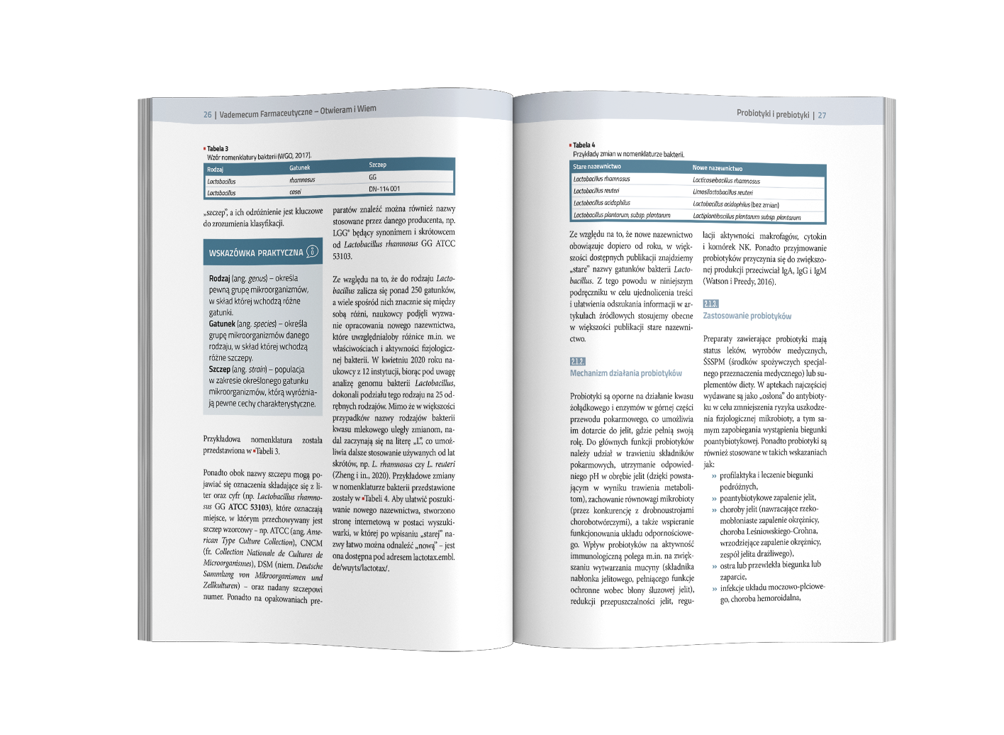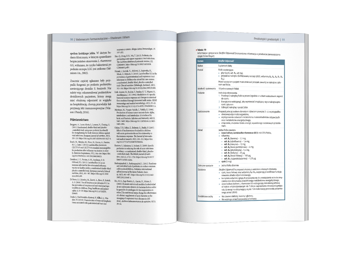 Podręcznik Probiotyki i prebiotyki. Kompendium wiedzy dla farmaceutów i lekarzy z serii Vademecum Farmaceutyczne stanowi zbiór wiedzy o działaniu i zastosowaniu probiotyków i prebiotyków w częstych dolegliwościach, których etiologia może być związana zaburzeniem równowagi mikrobioty. Treść jest oparta o dostępne badania naukowe, w tym wysokiej jakości metaanalizy i przeglądy systematyczne.