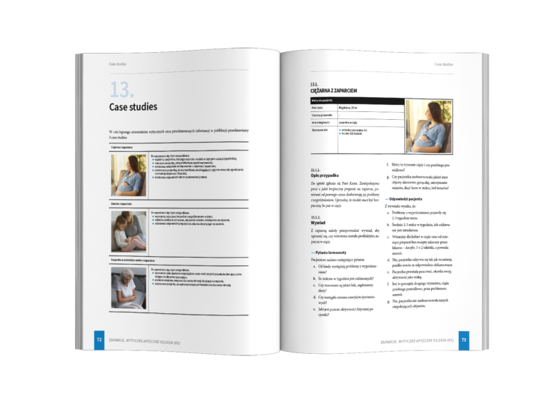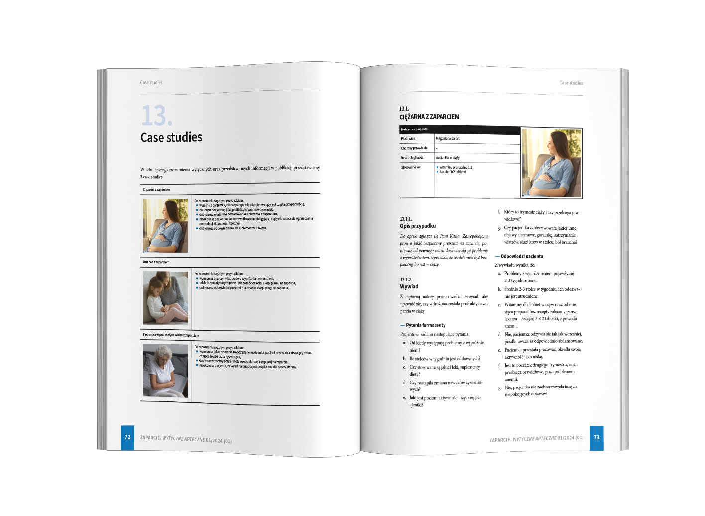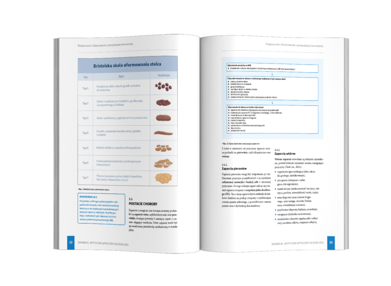 W publikacji opisano pytania, jakie należy zadać pacjentowi z zaparciem, przeprowadzając wywiad farmaceutyczny, m.in: