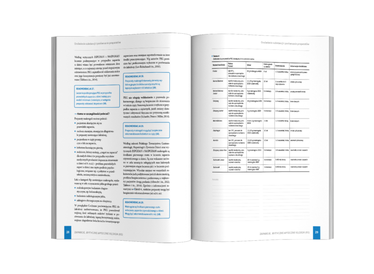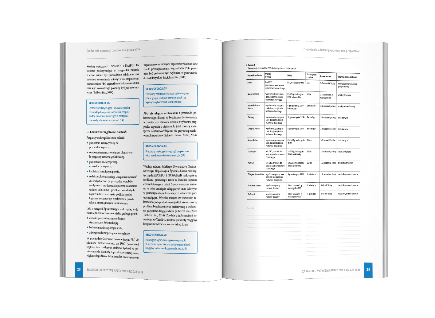 Osobno opisano konkretne substancje (m.in.: makrogole, laktulozę, glicerol, fosforany, siarczan magnezu, antrazwiązki czy bisakodyl) i ich możliwe zastosowanie w oparciu o wcześniej omawiane wytyczne. W tabelach zestawiono preparaty dostępne w Polsce, dzięki czemu będziesz wiedział, co polecić pacjentowi w zależności od wieku czy preferowanej postaci.