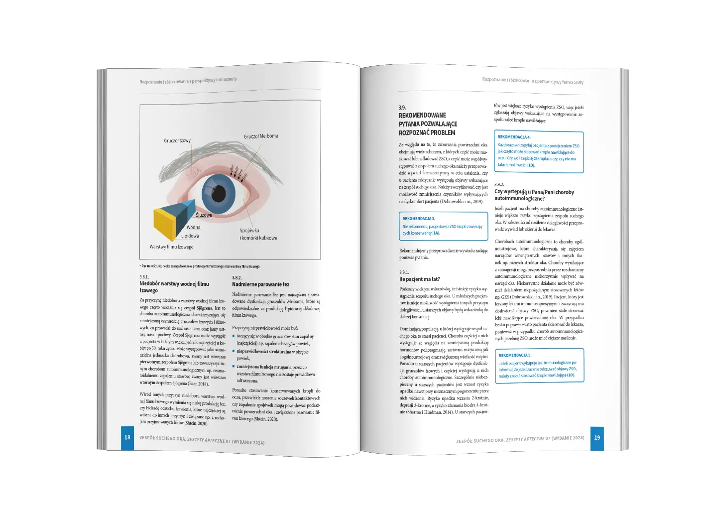 Omówiono także postępowanie niefarmakologiczne, profilaktykę oraz produkty komplementarne, takie jak ciepłe okłady na powieki, preparaty do higieny powiek oraz suplementy wspomagające leczenie ZSO, a także przedstawiono leki, które farmaceuta może zalecić w ramach recepty farmaceutycznej. Publikacja wzbogacona jest także w pytania, dzięki którym farmaceuta nauczy się jak przeprowadzić skuteczny wywiad z pacjentem.