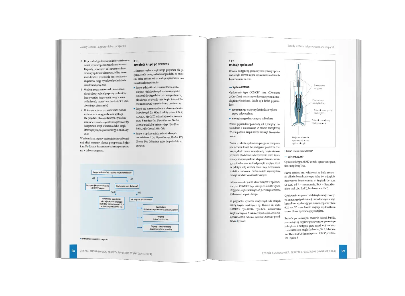W publikacji opisano typowe objawy takie jak uczucie suchości, pieczenie, zaczerwienienie i nadmierna łzawienie. Publikacja zawiera przegląd dostępnych w aptece preparatów, takich jak krople nawilżające, żele i preparaty zawierające kwas hialuronowy, opisując ich skład, działanie oraz dawkowanie. Publikacja obejmuje także algorytmy i schematy konsultacji w aptece, które wspierają farmaceutów w podejmowaniu decyzji dotyczących leczenia i doradztwa dla pacjentów z zespołem suchego oka. Zapewniają one kompleksową opiekę farmaceutyczną, uwzględniając różnorodne scenariusze kliniczne i indywidualne potrzeby pacjenta.